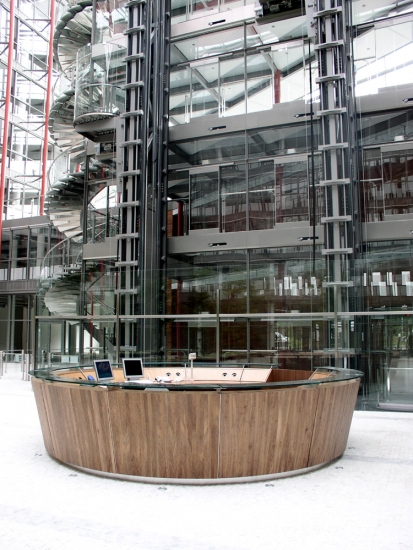 V této zakázce bylo jedinečné použití masivního ořechu, který je ručně dlabaný. Jedná se v podstatě o sochařské dílo - Vít Novotný, které je spojené s dokonalou high technologií. Propojení přírodního a průmyslového materiálu, zapracování detailů - držení skel, nerezových lišt a vyústění klimatizace a IT technologií vyžaduje zručnost a cit. Pokud pracujeme na takových zakázkách, spolupracujeme s výtvarníky - sochaři, kteří dokáží velice citlivě řešit někdy i neřešitelné.